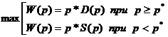 При цене p > p* объем продаж и выручка определяется функцией спроса, при p < p* - предложения. Необходимо найти цену