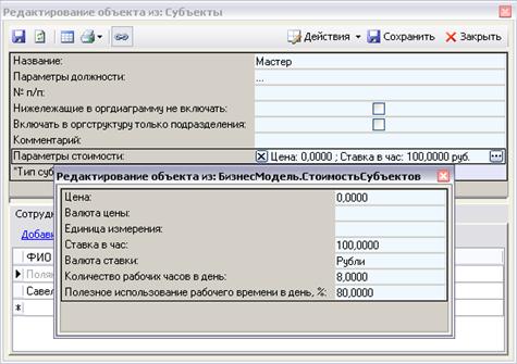 значения параметров «Время выполнения» и «Стоимость процесса» отображаются в