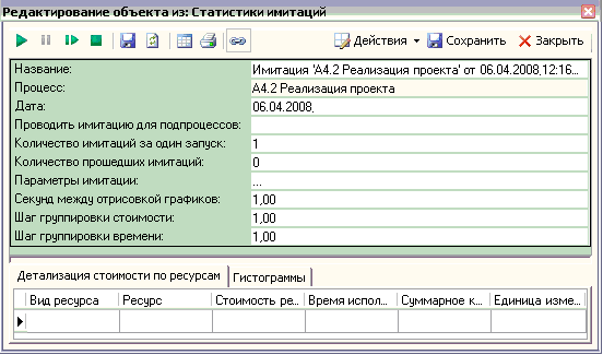 расположена на панели форматирования диаграммы процесса. Появится окно имитации
