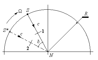 момент приема светового сигнала; S – действительное положение источника в тот же момент времени; R – расстояние, измеренное