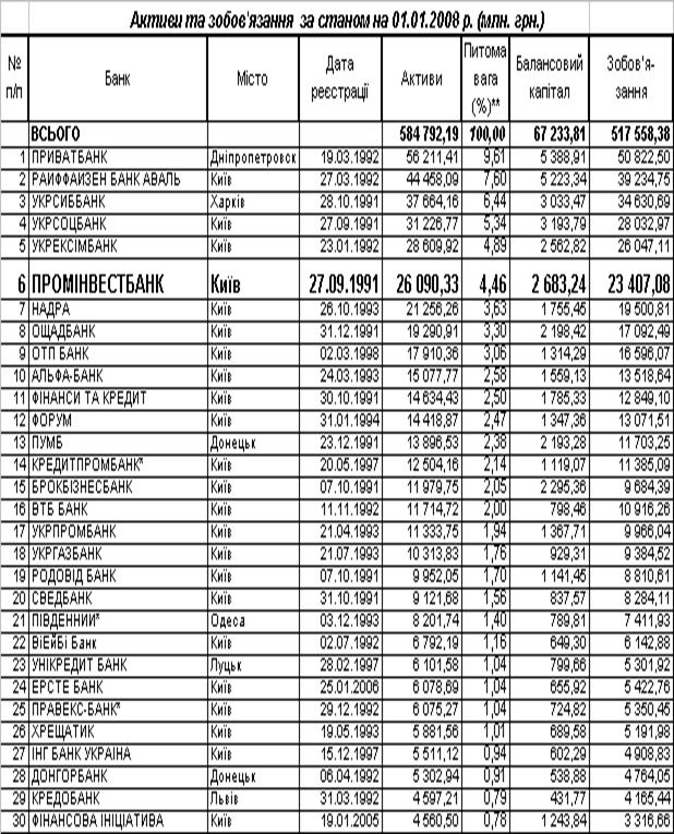 діяльності АТЗТ «АК Промінвестбанк» та інших комерційних банків України першої