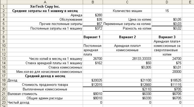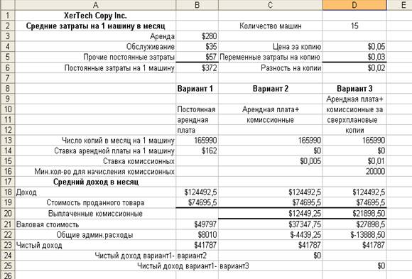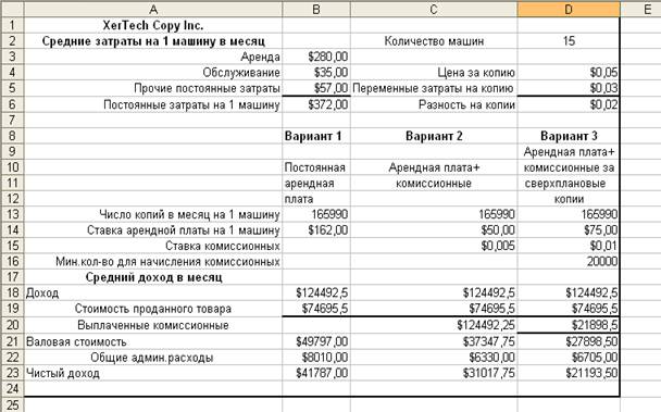 Рис. 2 - Три варианта арендной платы компании XerTech
