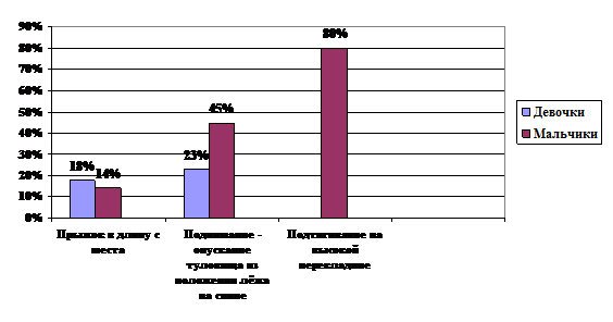 – прыжок в длину с места не справились 17,8 % девочек и 14,3 % мальчиков.