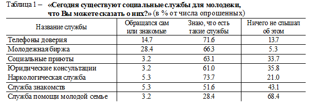 служб как наркологическая (73,7%), телефон доверия (71,6%), молодежная биржа