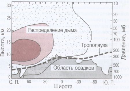 атмосферы. Показаны распределение дыма на 15-20 сутки и область формирования
