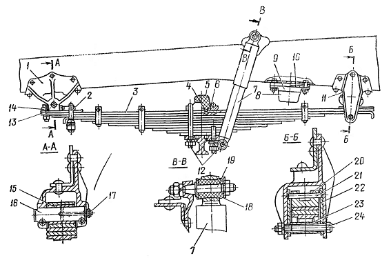 кронштейн; 12 - стремянки; 13 -подкладка ушка рессоры; 14 - ушко рессоры; 15 -