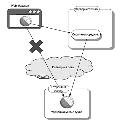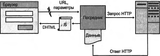 Компонент-посредник (например, объект XmlHttpRequest) отправляет обычный запрос HTTP и дожидается (синхронно или