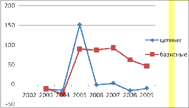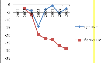 Максимальная убыль (баз.) наблюдается в 2004 г.