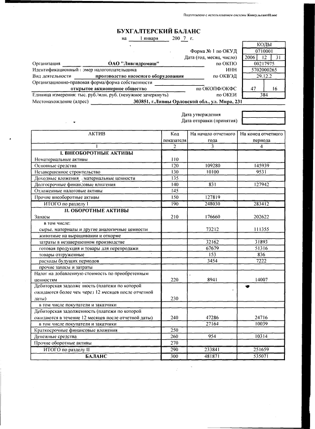 реклассификацию кредиторской задолженности баланса ОАО «Ливгидромаш» в статьи