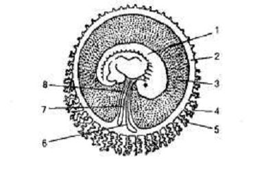 жидкостью; 4 - хорион с ворсинками, образующими детское место (5); 6 - пупочный