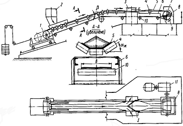 разгрузочную воронку 8 или в промежуточных пунктах конвейера при помощи