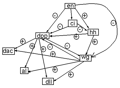 Рис.1. Пример генной сети: ГС роста лапки