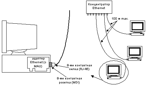 соединялась с центральным концентратором (hub). Такой вариант реализации