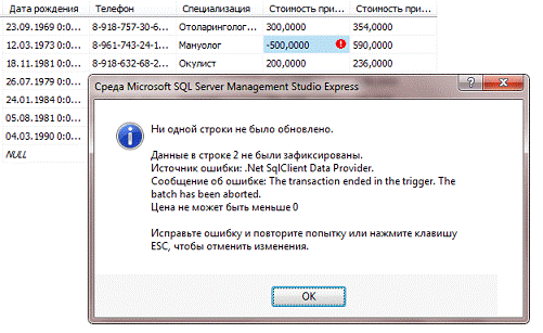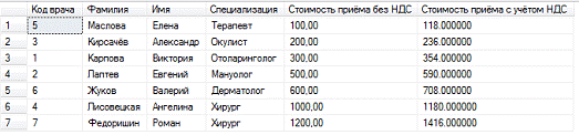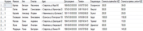 адрес, дата рождения, телефон, специализация, стоимость приёма без НДС,