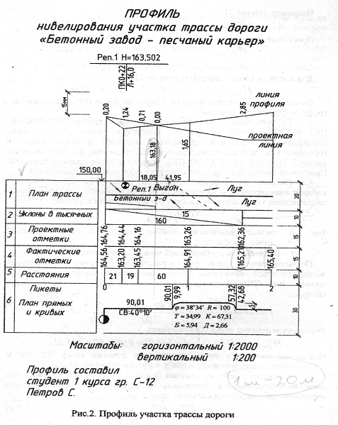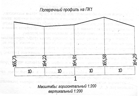 отметкам точек поперечного к трассе направления и пикета №2 по аналогии с