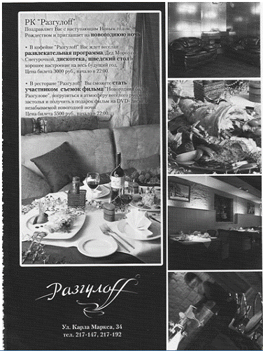рекламы", что в данном случае отсутствует. Рекламное сообщение ресторана "Разгулоff" размещено в журнале "Catalog" (выпуск №12 (16) декабрь 2007 г.). Нарушение: