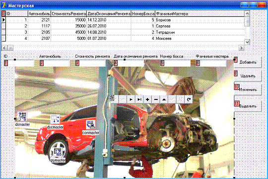 автомобиля в мастерской. Также в базе хранятся и легко редактируются данные о