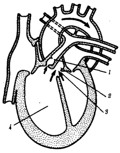 -стеноз легочного ствола. 2-транспозиция аорты, 3-дефект межжелудочковой