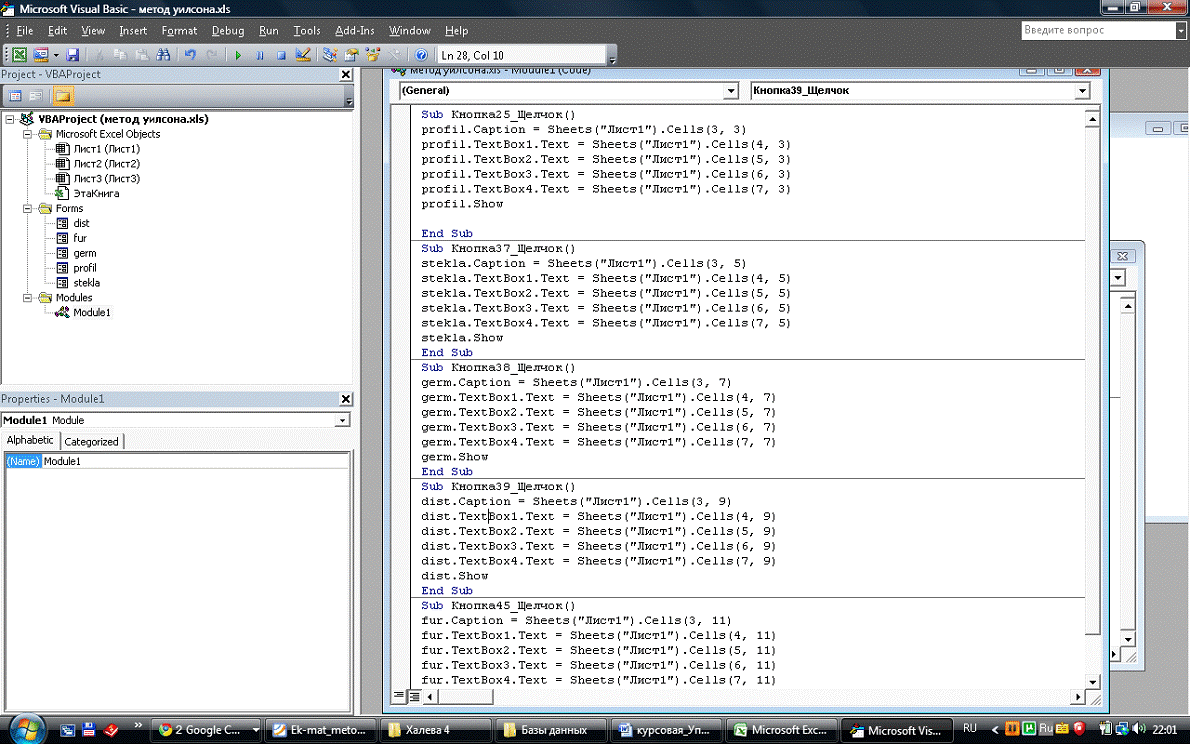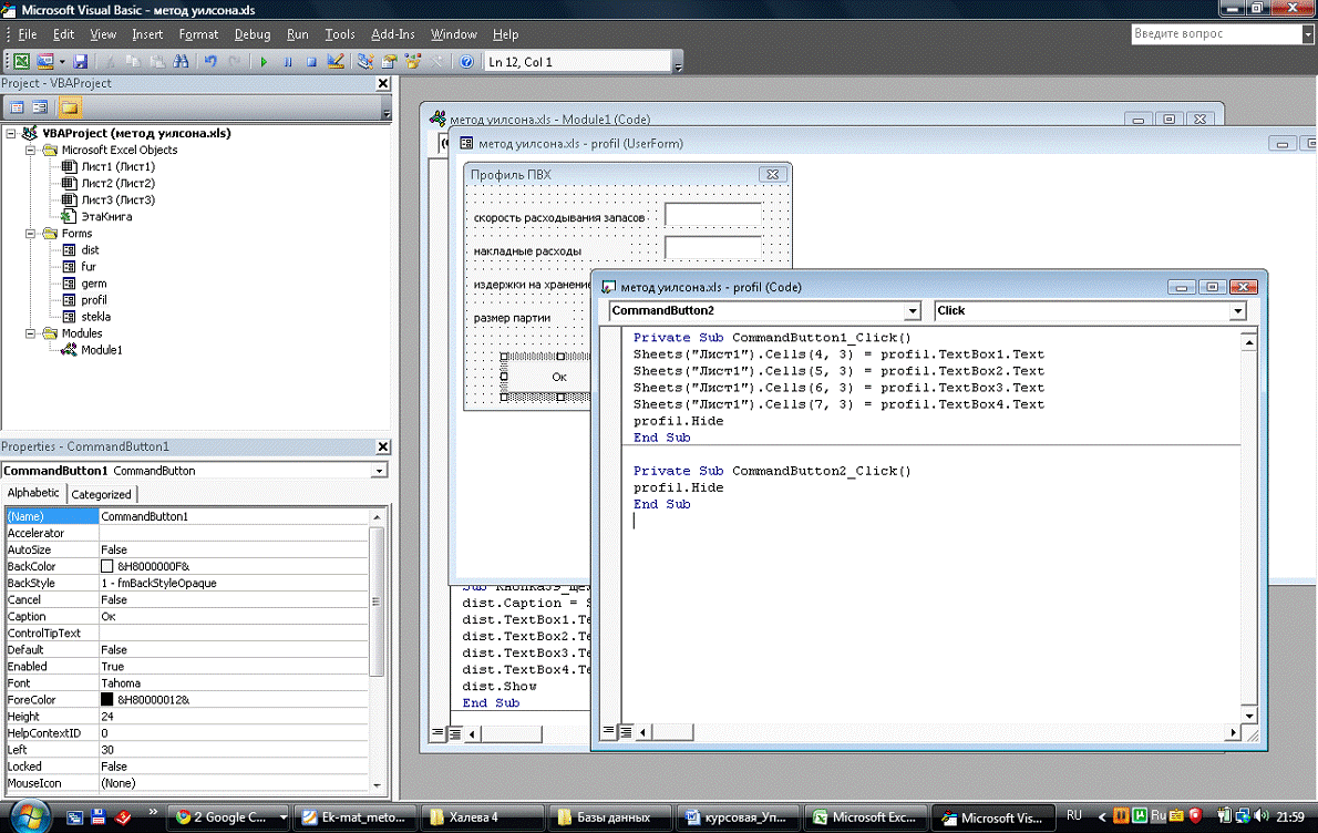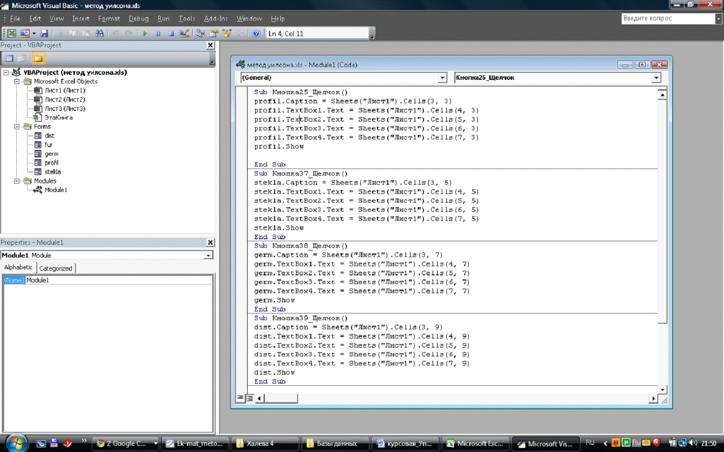 заполнение полей формы данными с листа «Лист1».
