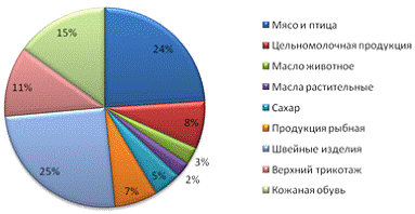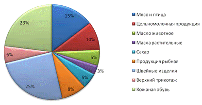 продовольственные товары, ведущее положение занимает мясо и птица - 25%,