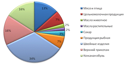 товаров занимает швейные изделия - 34%, немногим меньше потребляют верхний