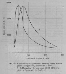 швидкостях різання - убуває монотонно. Його падіння при v>vІ2