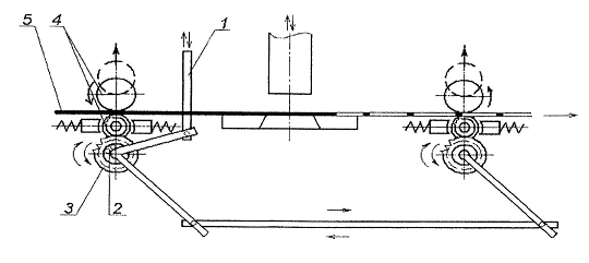 4 и перемещение ленты на величину шага подачи. При движении тяги вниз ролики