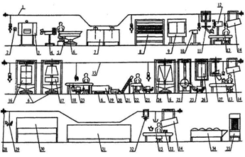 переработки; 7 - ванна шпарки; 8,9 - машины снятия оперения; 10 - машина