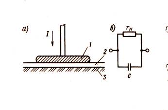 схема контакта электрода с телом человека; б— электрическая схема замещения;