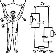 1 – электрод, 2 – наружное сопротивление кожи рук, rвр ,