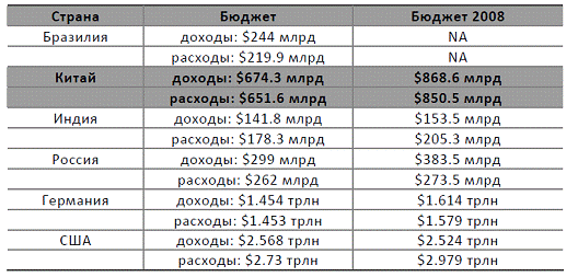 Китая) был заложен дефицит бюджета на 2009 г. в размере 500 млрд юаней ($73,5