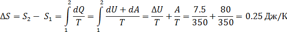 T = 350 К = const, A = 80 Дж, ΔU = 7.5 Дж, S - ?