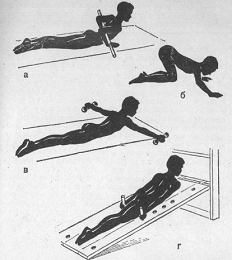 п. - лежа на спине на наклонной плоскости, взявшись руками за рейку