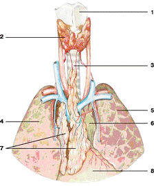 ней прилегает сосудисто-нервный пучок шеи, а сзади располагаются хрящи гортани,