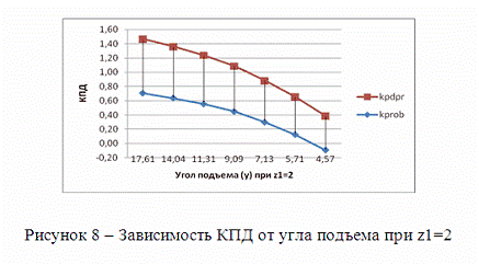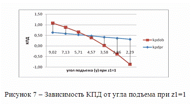 зависимости прямого и обратного КПД от угла подъема при z1=1 и z1=2 представлены
