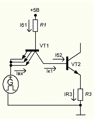 подаче высокого уровня напряжения на вход транзистора VT1, переходы
