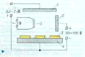 система электродов, 4 - поверхностная акустическая волна, 5 - световые потоки.