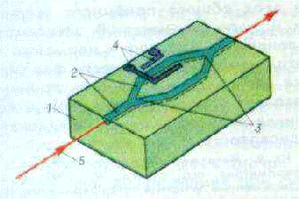 интегрально-оптические волноводы, 3 - электроды, 4 - световые потоки.