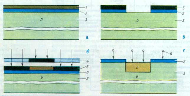 фотошаблон, 5 - засвеченный участок фоторезиста, 6 - донорные атомы.
