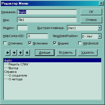 Menu Editor. В появившемся диалоговом окне напишем названия пунктов меню и