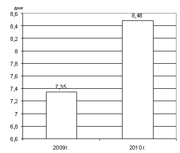 оборота увеличилась с 7,35 дней в 2009 г. до 8,48 дней в 2010г. Наблюдается