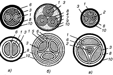 жилами; б- трехжильные кабели с поясной изоляцией и отдельными оболочками; в -