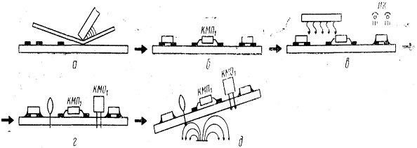 нанесение клея на поверхность платы; установка КМП на контактные