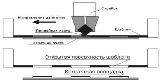 нанесение припойной пасты через трафареты на контактные площадки печатной