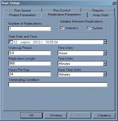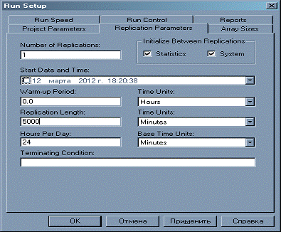 Для задания длительности моделирования перейдем в меню Run/Setup. В поле Replication Length установим
