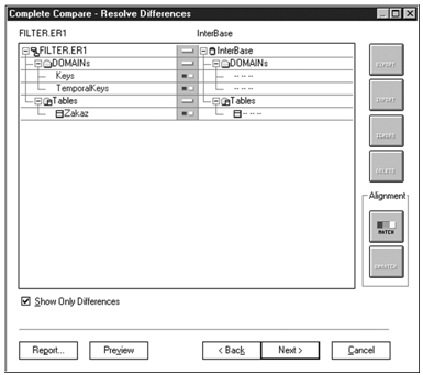 БД, устанавливается сеанс связи с сервером и в диалоге Complete Compare Resolve Differences показывается текущее