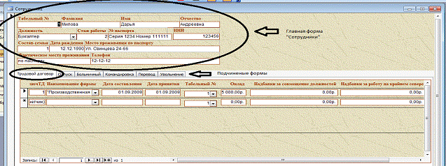 В представляемой БД главной формой является форма «Личная карточка». Все