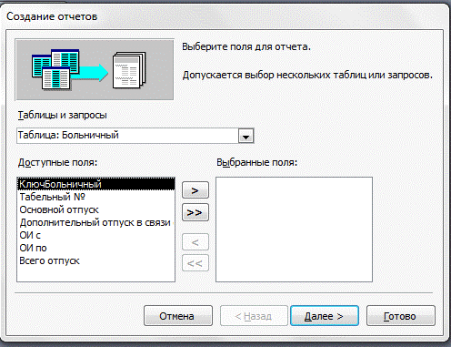нужно сначала выбрать поля из созданных таблиц или запросов для отчета.