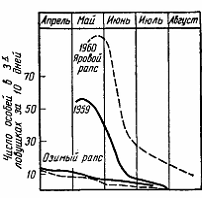 Рис. 1. Развитие популяций Meligethes aeneus (-)