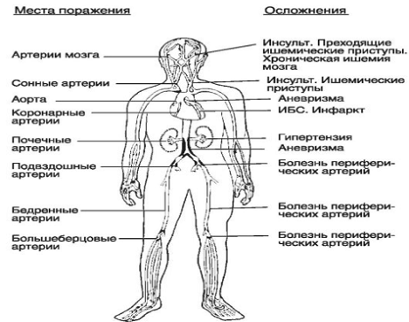 стенке артерий специфических для данной патологии атероматозных бляшек, вызывающих